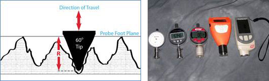 Los instrumentos de rugosidad de palpadores registran los movimientos ascendentes y descendentes de un palpador externo que recorre una superficie (Fig. 5). Miden un parámetro de altura denominado Rt, de acuerdo con la norma ISO11 428712, que proporciona la distancia vertical entre el pico más alto y el valle más bajo dentro de cualquier longitud de evaluación de 0,5 pulgadas (12,5 mm). Se realizan cinco trazados y se promedian los valores de Rt para obtener la media de las distancias máximas entre picos y valles.