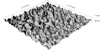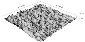 Una vez aplicada la relación grosor/transparencia a la interpretación de la imagen de intensidad, pueden extraerse otros parámetros de caracterización de la superficie mediante un software de representación tridimensional (3D). El resultado son mapas en 3D de la superficie del acero granallado a un costo muy inferior al de los dispositivos de perfilado interferométrico o confocal. En las figuras 10 a 12 se muestra un ejemplo de cómo funciona el proceso.