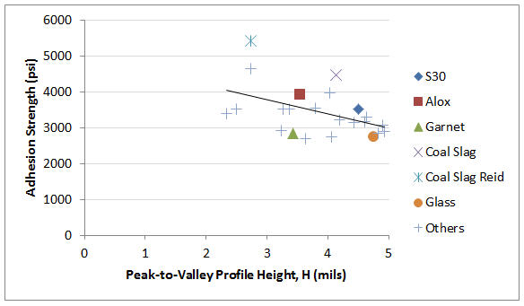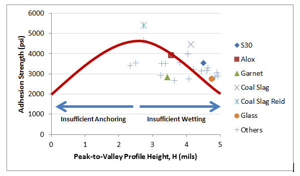 En general, se acepta que la naturaleza de las superficies de acero limpiadas con chorro de arena predice el rendimiento del revestimiento a largo plazo. La industria de la corrosión no comprende del todo la dinámica de este complejo problema, pero dispone de varios parámetros medibles, como la altura de los picos, la densidad de los picos, el área de la superficie, la angulosidad, la nitidez y la forma. Las creencias comunes de la industria sugieren que aumentar varios de estos parámetros mejorará el rendimiento del revestimiento a largo plazo. Los datos empíricos sugieren que no es tan sencillo.
