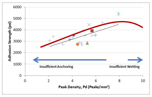 En la figura 22 se resume un gráfico del área de superficie desarrollada observada frente a la adhesión. Los datos at primero parece contradecir a Roper et. La afirmación de Al de que "cuanto mayor sea la superficie para el recubrimiento, mejor". Sin embargo, los autores continúan afirmando que las dos formas principales de aumentar el área de superficie, aumentar la altura del pico y aumentar la densidad del pico, pueden inhibir la humectación y ser perjudiciales para el rendimiento del recubrimiento más allá de un punto óptimo. Se cree que los datos de este estudio reflejan su afirmación. Las mediciones de área de superficie altamente desarrolladas en varias de las muestras (perlas de vidrio, por ejemplo) parecen haber sido un reflejo de las altas distancias de pico a valle en esas muestras. Por lo tanto, no es de extrañar que las muestras con áreas de superficie altamente desarrolladas debido a alturas de pico a valle excesivamente altas exhibieran un rendimiento de recubrimiento deficiente.