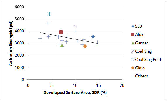 La hipótesis es que si la altura de pico y la densidad de pico se mantuvieran constantes, habría una correlación positiva entre la superficie desarrollada y la fuerza de adhesión. Sin embargo, esta correlación positiva parece leve y, como muestra este estudio, no es significativa en comparación con los efectos de la altura de pico y la densidad de pico. Además, el autor de este trabajo no conoce ningún medio práctico para modificar la superficie desarrollada con medios abrasivos manteniendo constantes los valores de altura y densidad de pico. Por lo tanto, parece que tiene poco sentido práctico informar sobre la superficie desarrollada en la industria de la limpieza por chorro.