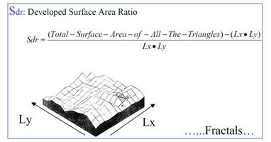 Según la norma ASME B46.1, la relación de área interfacial desarrollada Sdr es el porcentaje de área superficial adicional aportada por la textura en comparación con un plano ideal del tamaño de la región de medición, tal como se calcula en la figura 23. Se calcula en función de la escala sumando las áreas de una serie de baldosas virtuales que cubren la superficie medida a modo de mosaico.